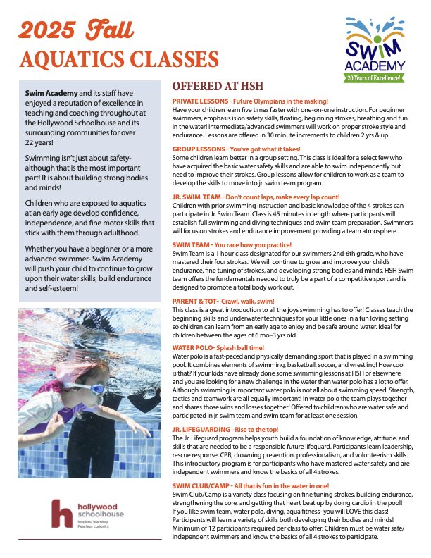 Hollywood Schoolhouse and Swim Academy have partnered to bring a dynamic, fun-filled swim program to life, right on campus. From first-time swimmers to seasoned teammates, everyone is welcome to dive in.